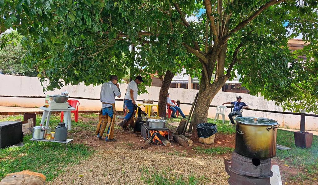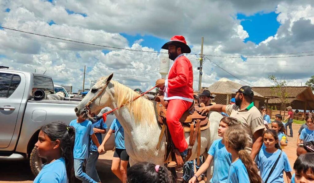 Os alunos, além de presentes, receberam lanches e almoçaram um delicioso carreteiro, macarrão pantaneira, feijão, mandioca e salada, tudo preparado no melhor estilo de comitiva, sendo mais uma experiência para guardarem na memória deste dia.