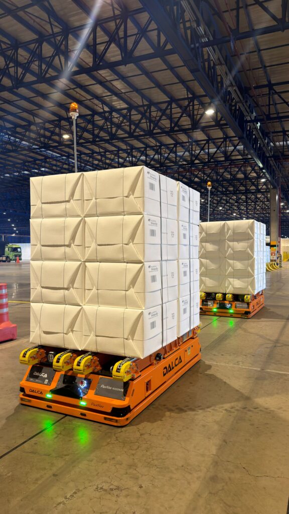 Desenvolvido de forma customizada para atender às necessidades da companhia, o FlexNav tem capacidade para transportar até quatro toneladas e foi projetado para acomodar dois conjuntos de fardos de celulose por operação. Os robôs operam de forma totalmente autônoma, conectados em tempo real a um sistema central que monitora e coordena as atividades, incluindo a gestão do carregamento das baterias. A solução permite que a celulose seja retirada diretamente da linha de produção e transportada até pontos específicos do armazém, sem necessidade de manuseio manual.