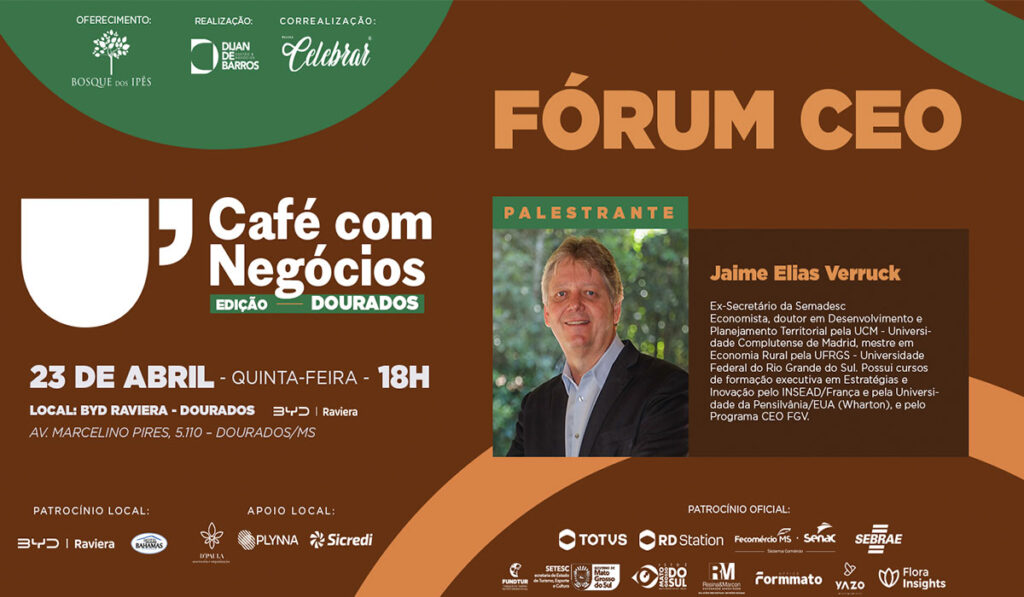 O Café com Negócios retorna a Dourados no dia 23 de abril com o Fórum CEO, evento que reunirá empresários, executivos e lideranças em um encontro de alto nível para debater desenvolvimento econômico, estratégias e oportunidades em Mato Grosso do Sul. O palestrante será o ex-secretário de Estado de Meio Ambiente, Desenvolvimento, Ciência, Tecnologia e Inovação (Semadesc), Jaime Elias Verruck. A programação começa às 18h, na BYD Dourados, com correalização da Revista Celebrar.